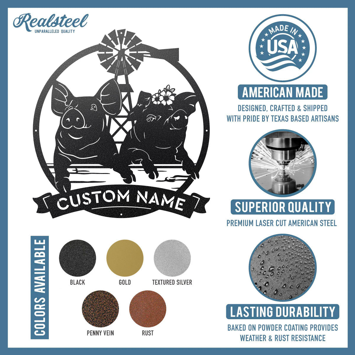 Bring the warmth of the countryside to your home with our Happy Pigs Couple on a Farmland Monogram! This charming metal sign features two joyful pigs leaning over a farm fence, set against a classic windmill backdrop. Perfect for farmhouses, barns, gardens, or front porches, this delightful design adds a touch of rustic charm and personality to any space.