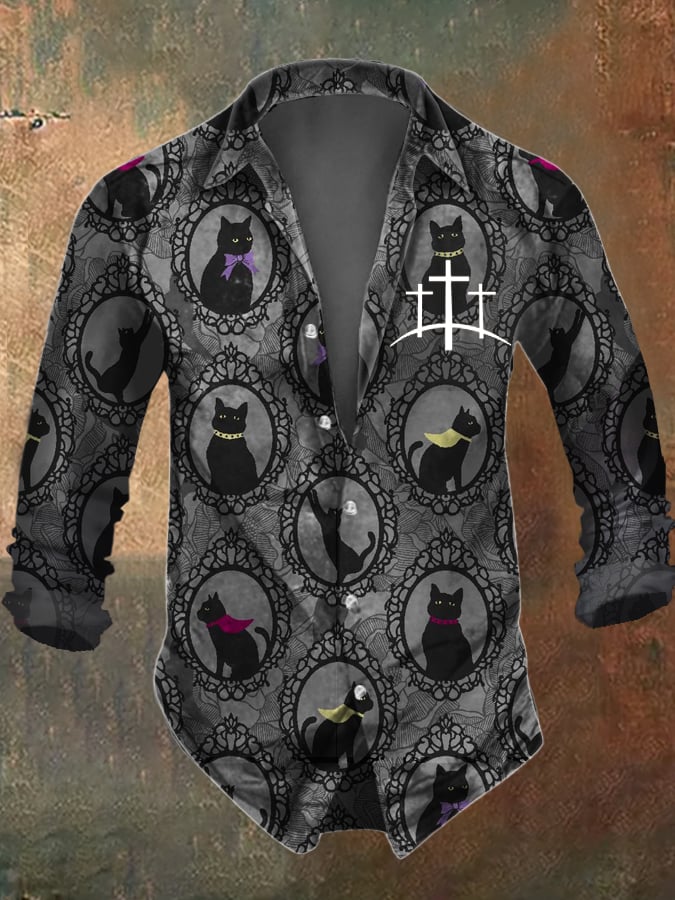 Men's Retro Gothic Cat Print Long Sleeve Shirt