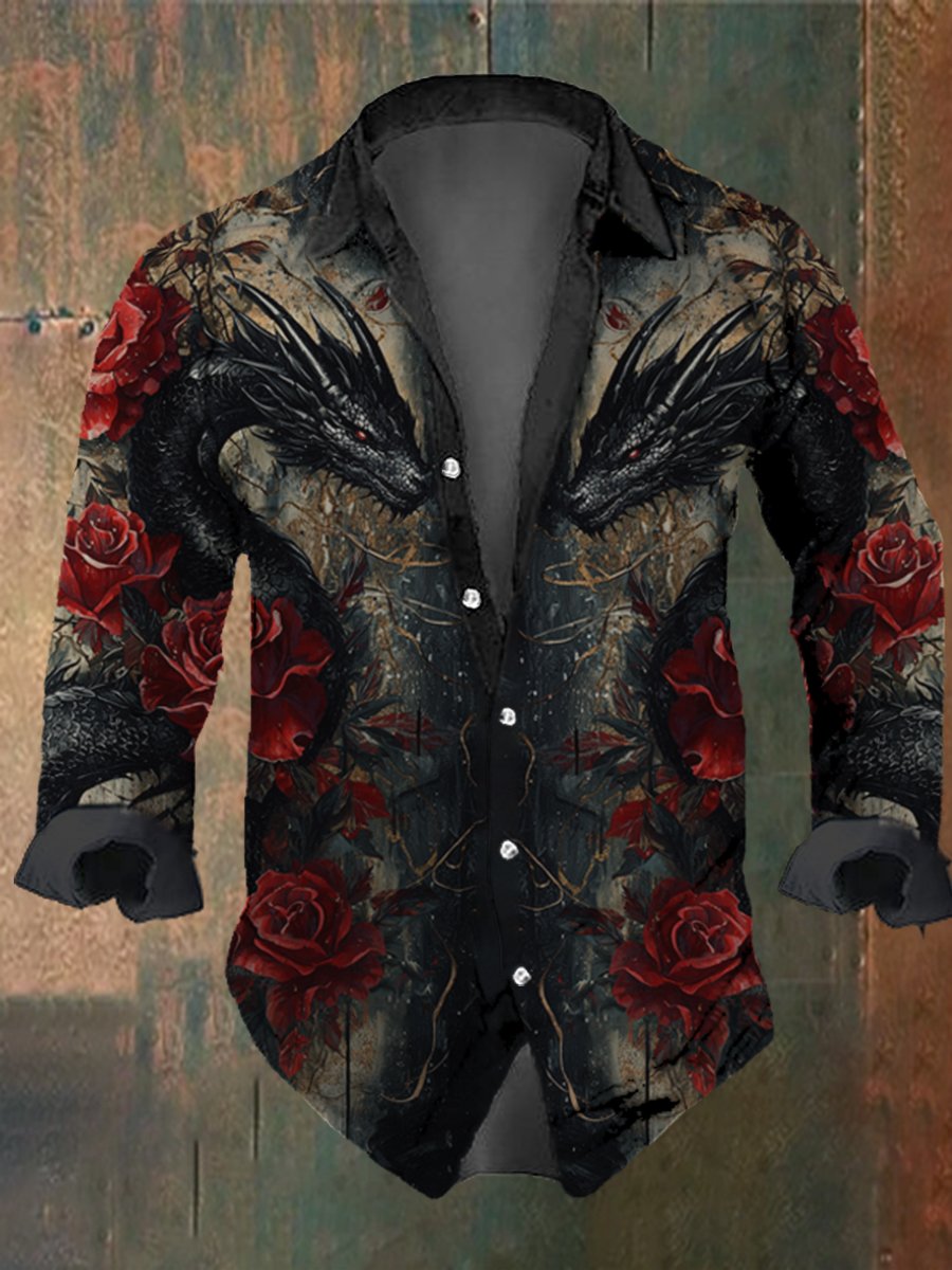 Men's Vintage Black Dragon Rose Print Long Sleeve Shirt