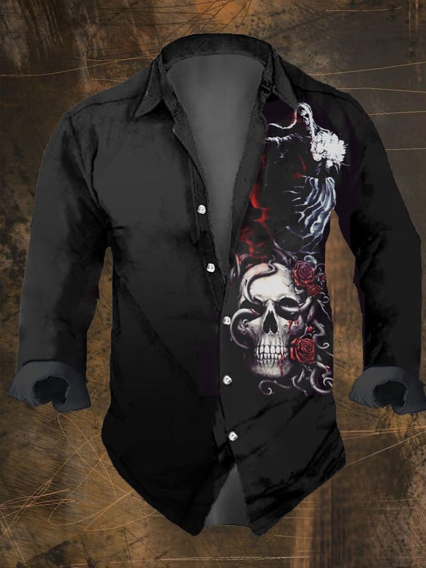 Men's Vintage Dark Skull Print Long Sleeve Shirt