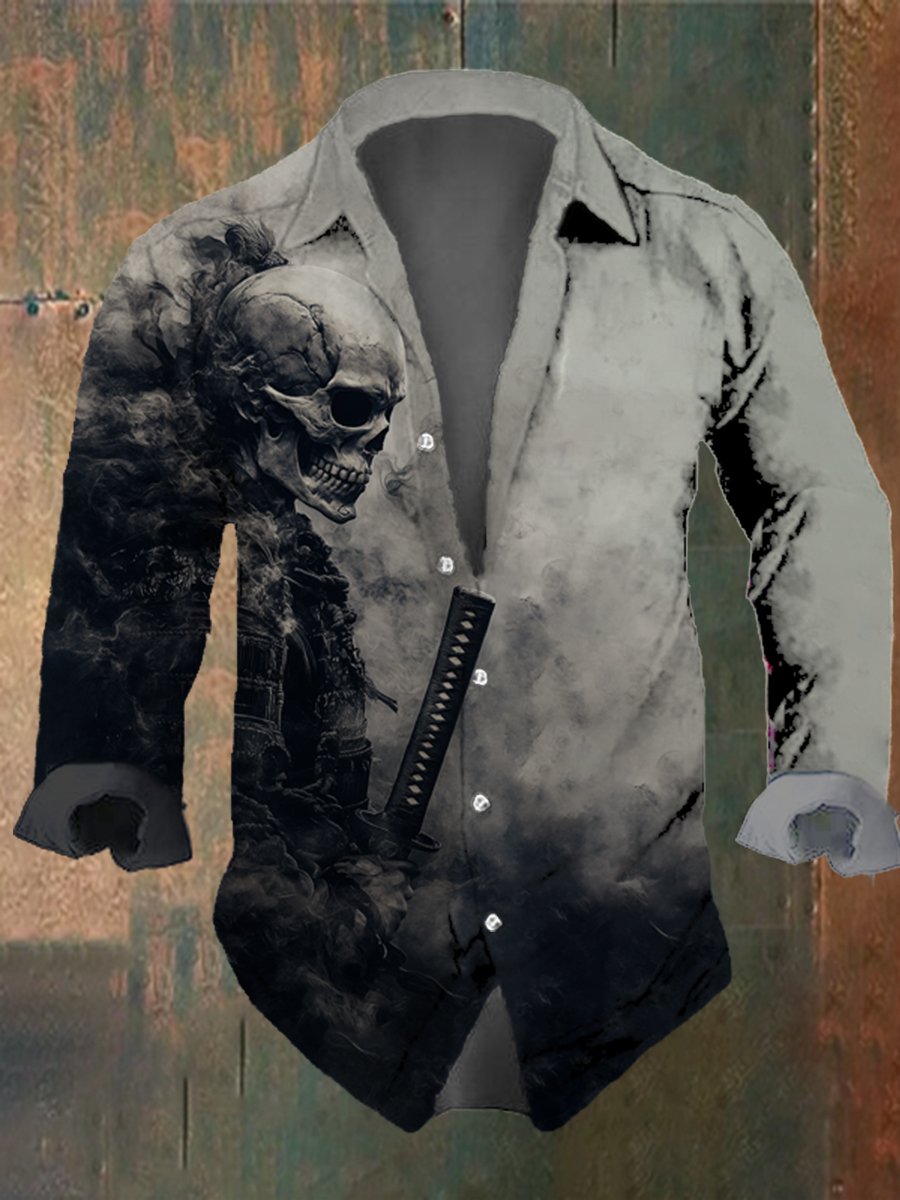 Men's Vintage Japanese Skull Samurai Print Long Sleeve Shirt