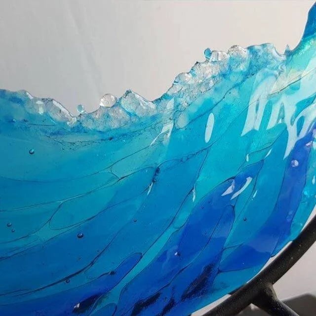 Crushed clear and white sculpture is added to bring the water and sea froth to life. It is placed in a hot kiln for 16 hours to melt the sculpture into the final piece. It includes a black, iron stand for display. The sculpture stand 14 inches high with the stand. The depth of the stand base is 6 inches.
