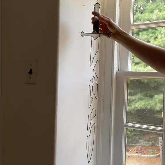 The individual shards are detailed in silver to mimic the 3-dimensionality of the sword and are connected to each other with clear filament- giving the illusion that the pieces are floating.